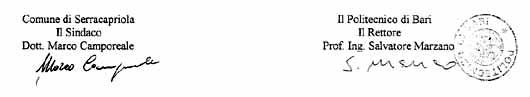 Il Comune di Serracapriola mette a disposizione, gratuitamente, del Politecnico di Bari e per esso al Laboratorio didattico di Fotogrammetria Architettonica della Facoltà di Architettura, che a tale titolo riceve e accetta, una sala da dedicare ad aula didattica per l'insegnamento a distanza.