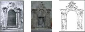 Portale prima del crollo del fregio, come si presentava prima dellintervento di restauro, simulazione vettoriale del portale