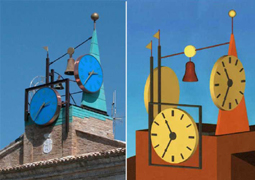 - il quadrante dei tre orologi, perfettamente uguali nel progetto, presentano le lancette ed i numeri di colore nero su sfondo giallo, mentre nella realtà il quadrante esposto a nord si differenzia nettamente dagli altri due, che presentano i numeri di colore bianco su fondo azzurro;