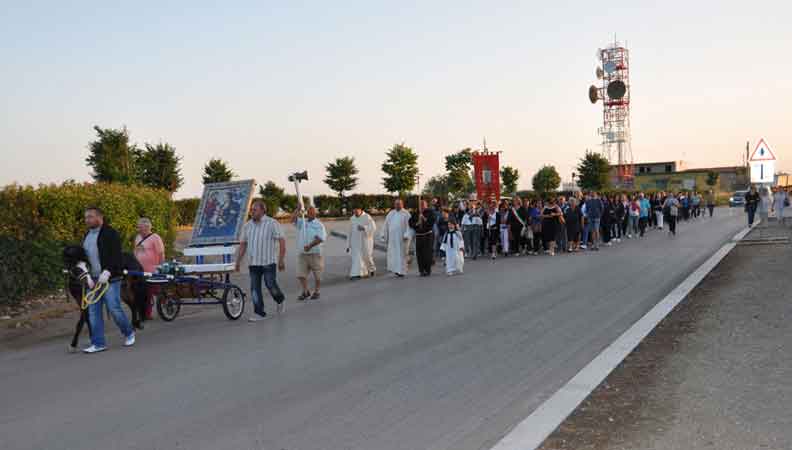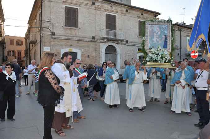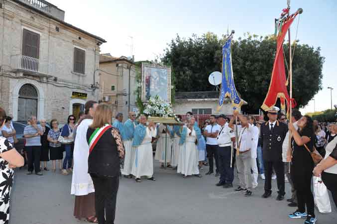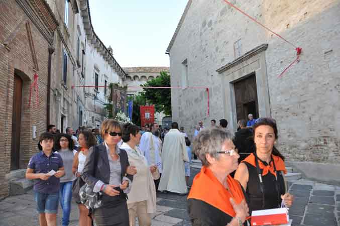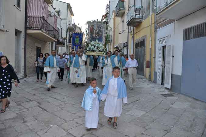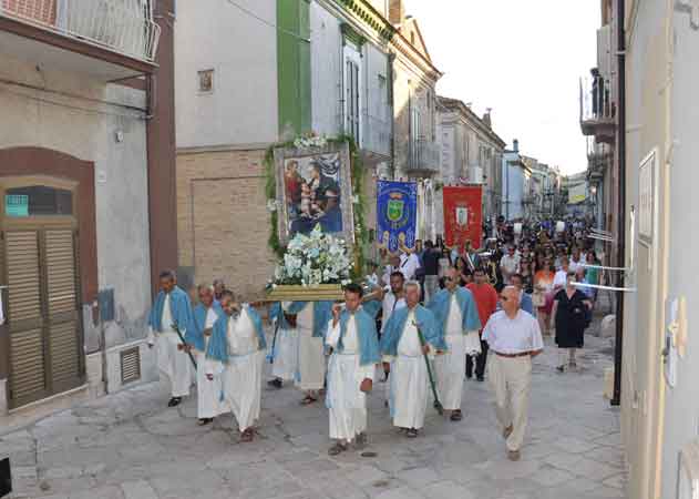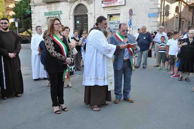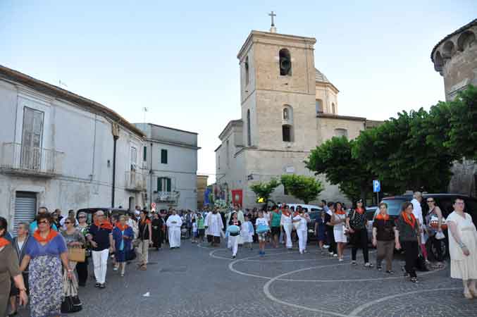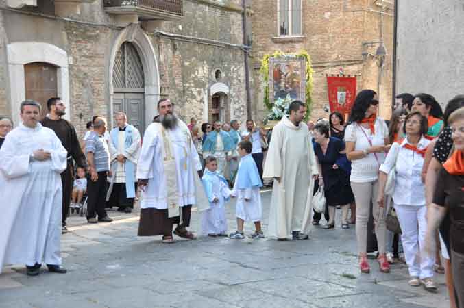 Alle ore 18 è uscita la solenne processione della Madonna delle Grazie, accompagnata dalla banda musicale “Città di Larino”, dalle due comunità di Serracapriola e Chieuti con i rispettivi sindaci Marco Camporeale e Lucia Dardes e i gonfaloni dei due Comuni. Quest’anno il percorso è stato più lungo di quello tradizionale. La processione è partita da piazza P. Pio, proseguendo per via Marconi, via Attilio Lombardi, viale Aldo Moro, Corso Garibaldi, piazza V.Emanuele III, ha girato intorno alla chiesa di S. Maria, accolta dal suono delle campane, ha continuato per via S.Maria del Monte, per la Zona 167 ed è tornata al convento per viale Italia, gremito di ambulanti che offrivano ogni sorta di mercanzia.