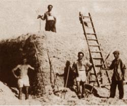 gli spioventi del tetto con stoppia trattenuta da verghe intrecciate orizzontalmente.