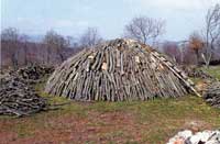 Si cominciava con lo scegliere il sito per la carbonaia (chètòzze), un terreno piano, ampio e solido, la “piazza” o “area del fornello”, protetto dai venti e vicino ad una sorgente d’acqua o ad un pozzo. Si tracciava una linea circolare della grandezza della carbonaia voluta, impostando una canna fumaria al centro del cerchio, intorno al quale venivano accatastati i legni di leccio, già tagliati, e opportunamente accostati. Si erigeva così a chètòzze, una catasta di forma conica. Si copriva tutta la superficie esterna di foglie, di altro materiale del sottobosco e infine di terra, la così detta camicia, per impedire la penetrazione dell’aria. La carbonaia veniva accesa, salendo sulla cima con una scala e introducendo la brace nella canna fumaria. Si chiudeva la buca con una pietra piatta. I carbonai giorno e notte controllavano il procedere della combustione sostituendo la terra che si staccava dalla camicia. Nella prima fase dell’essiccazione dalla carbonaia usciva un fumo bianco, si diceva che sudava. Nella seconda fase, quando la legna era diventata asciutta, e all’interno della catasta il calore aveva raggiunto i 350°, la carbonaia emetteva fumi acri, gialli e marrone. Iniziava la distillazione del legno, che emetteva gas, fra cui il biossido di carbonio. Nella terza fase i vapori, trasparenti azzurrognoli, usciti dalla canna fumaria annunciavano che era iniziata la distillazione (combustione del carbone). Questo era il momento più delicato in cui i carbonai dovevano praticare dei fori intorno al cono per far carbonizzare anche gli strati inferiori della catasta e per darle sfogo contro il rischio di un eventuale scoppio. Questo duro lavoro durava ininterrottamente giorno e notte per due settimane. Terminata la combustione si gettava terra sulla massa di carboni e si attendeva pazientemente la “sfornatura”. Completato il raffreddamento il carbone veniva valutato dai carbonai e dal datore di lavoro. Se si presentava leggero, asciutto, sonoro, scuro con bellissimi riflessi blu, era di ottima qualità. Da 100 quintali di legna si ricavavano 12-16 quintali di carbone. Il prodotto (carbone e carbonella), in sacchi di iuta da 25 Kg cadauno, veniva caricato sui carretti e consegnato alla ditta Carnevale che lo vendeva oltre che a Serracapriola anche nei paesi limitrofi. I carbonai intanto provvedevano a preparare una nuova carbonaia.