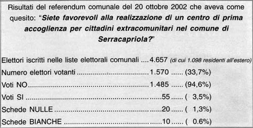 "Il 20 ottobre 2002, gli elettori di Serracapriola saranno chiamati per la prima volta alle urne per un referendum cittadino. Il quesito del referendum è: "Siete favorevoli alla realizzazione di un centro di prima accoglienza per extracomunitari nel comune di Serracapriola? ".
