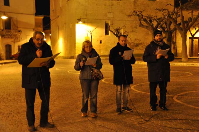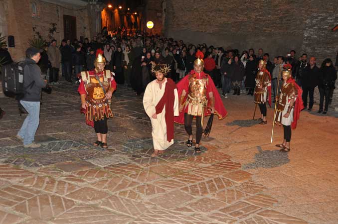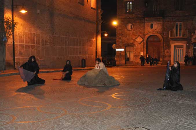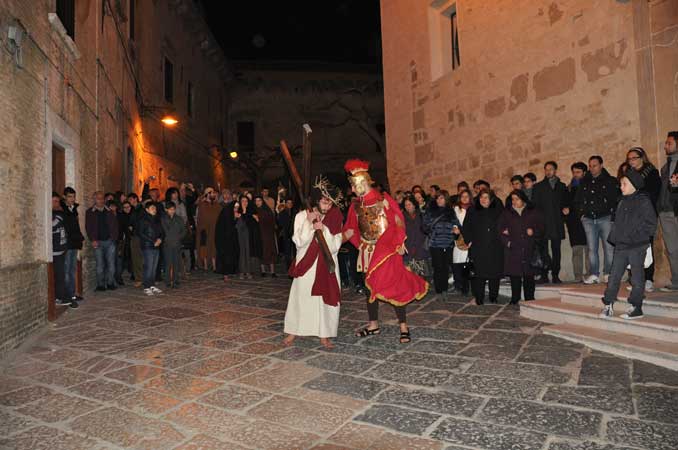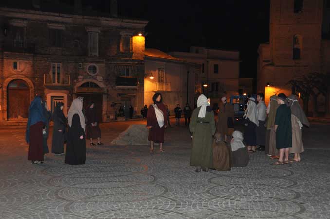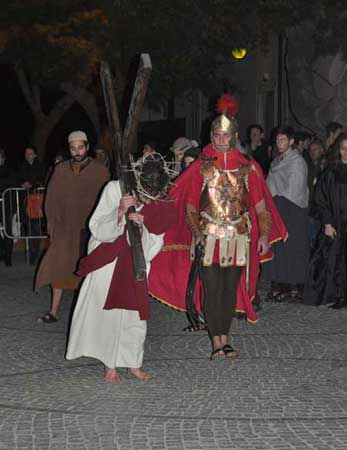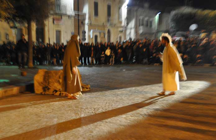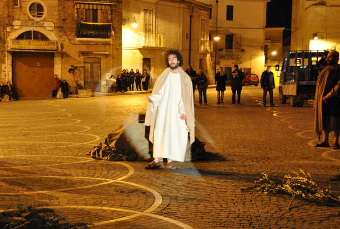 La rappresentazione, curata dalla regia di Gino Fiorentino, dalla scenografia essenziale, realizzata con pochi mezzi, in coerenza con il messaggio cristiano, è stata attuata con i figuranti, fra cui Michele Fiorentino, interprete di Gesù Cristo, e i narratori Giancarlo Mascolo, Lorenza Risoldi, Fortunato Tronco e Giuseppe Galante per commentare i vari quadri, illuminati dallocchio di bue, di alcune scene della vita terrena di Gesù. La prima parte, da Giovanni Battista fino al suicidio di Giuda, si è svolta in piazza V.Emanuele III; la seconda parte, dalla condanna a morte di Gesù, davanti allingresso del castello e la Via Crucis per la piazza, per via Bovio, fino a Largo S.Mercurio; la terza parte, dalla crocifissione e morte alla prima apparizione di Gesù risorto alle pie donne, davanti alla chiesa di S.Mercurio.