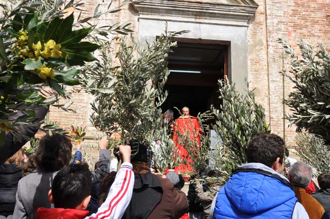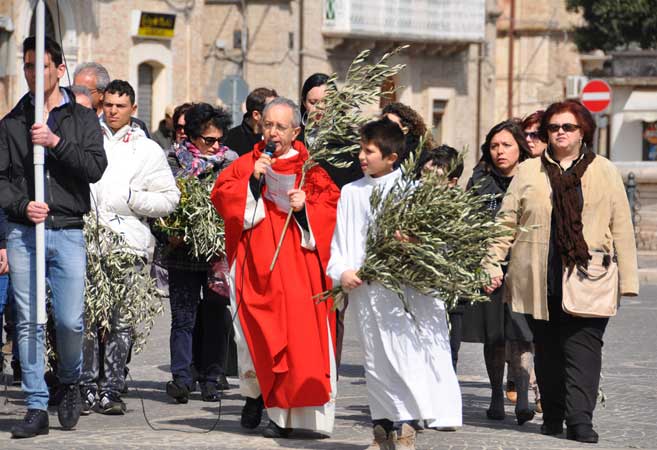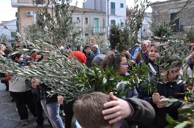La giornata soleggiata del 24 marzo ha permesso alle due comunità religiose del paese di partecipare al rito della benedizione delle palme allaperto con i ramoscelli dolivo e di alloro: alle ore 10 presso la statua di San Francesco la comunità francescana del convento P.Pio Giovane con lofficiante frate Luigi Lavecchia; alle 10,30 davanti alla chiesa di S.Anna la comunità parrocchiale di S.Maria in Silvis e di S.Mercurio M. con tanti bambini festanti e lofficiante parroco don Renato Orlando. Dopo il rito le due comunità si sono recate in processione nelle rispettive chiese di Maria SS.delle Grazie e di S.Maria in Silvis per partecipare alla S. Messa.