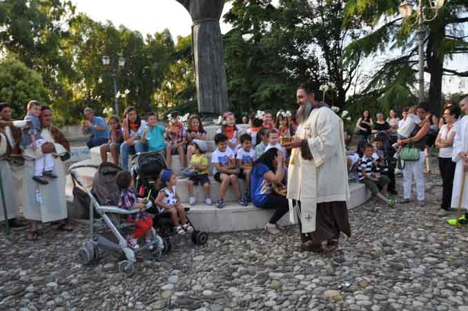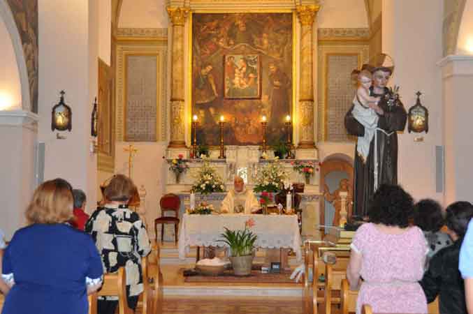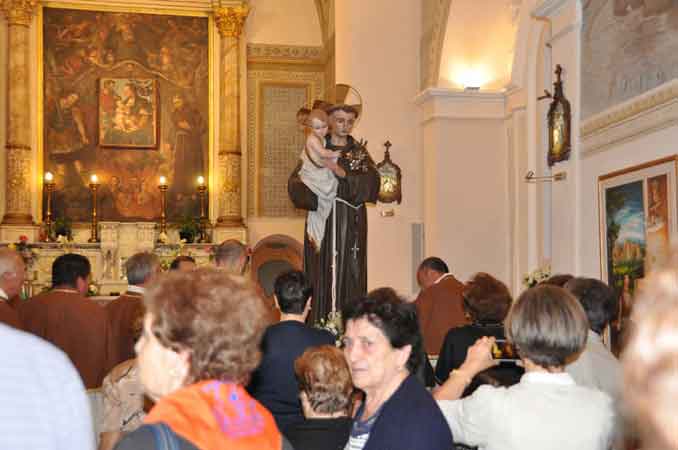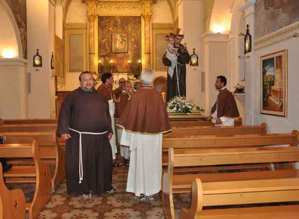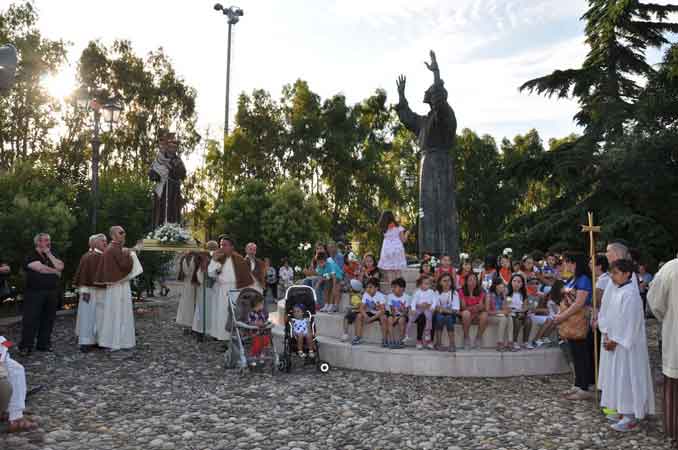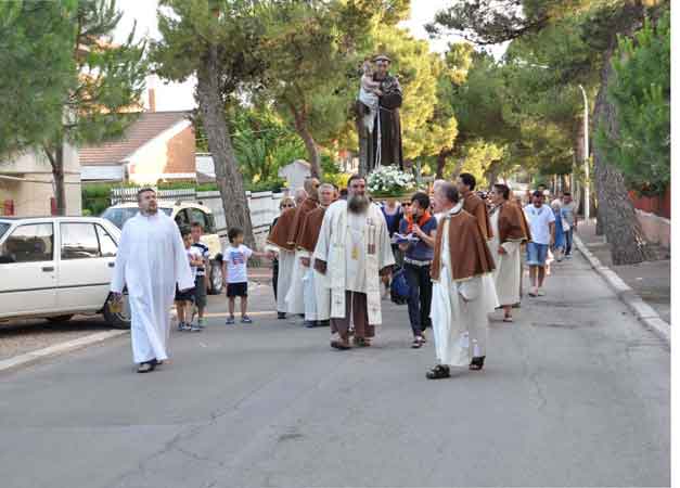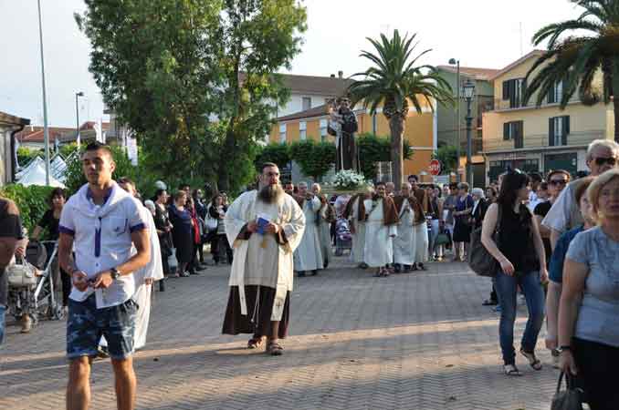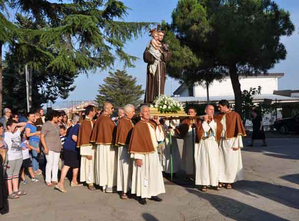 Il 13 giugno durante le messe sono state distribuite le pagnottelle benedette. Dopo la messa delle ore 17, celebrata da fr. Luigi Ciannilli, alle ore 18 è stata portata in processione la statua del santo da sette portatori con la partecipazione di tutta la comunità francescana: il guardiano fr. Giuseppe Ritrovato, fr. Gianpiero Tortorella, gli araldini, i gifrini, i francescani secolari e gli altri fedeli. In preghiera la peregrinatio ha percorso via Marconi, via Attilio Lombardi, fino all’oasi francescana, dove fr. Antonio ha benedetto i bambini con i gigli fra le mani, seduti davanti alla statua di S.Francesco. Si è vista in processione una mamma con il suo figlioletto vestito da fraticello (munècèlle). La tradizione, oggi in disuso, di far indossare ai bambini l’abito votivo benedetto del santo invocato, per impetrare grazie e protezione era molto sentita in passato. Si è tornati poi per via Italia in convento dove nella chiesa di Maria SS. Delle Grazie è stata concelebrata la messa solenne presieduta dal guardiano fr. Giuseppe.