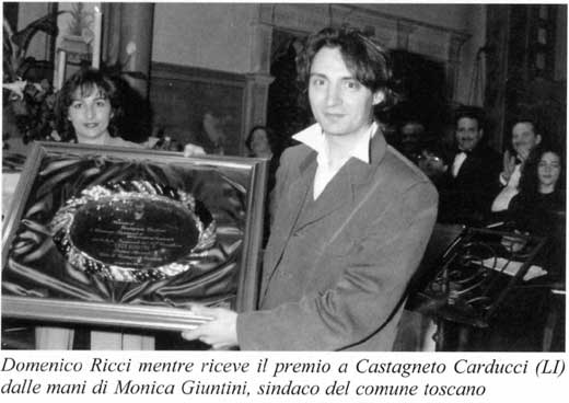 Anche se ancora giovane, Domenico Ricci ha già alle spalle una lunga e valida carriera di concertista e compositore, oltre ad un elenco di premi e riconoscimenti. Fra questi, per citarne solo uno dei più significativi, nel 1997 il primo premio speciale al sesto concorso nazionale di Composizione di Castagneto Carducci con l'opera "Crux" (ed. Musicali Rugginenti - Milano) su testo di Pasquale Maffeo, poeta, narratore e drammaturgo, ed eseguita dal coro diretto da Mino Bordignon.