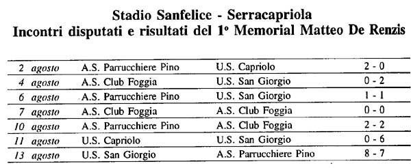 Pur battuta sul terreno di gioco dall'U.S. San Giorgio - Chieuti, per 8 a 7, la calcistica A.S. Parrucchiere Pino di Serracapriola si è aggiudicata di fatto la palma della vittoria del "1° Memorial Matteo De Renzis", disputatosi al "Sanfelice" dal 2 al 13 agosto 1995.