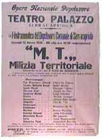 Un anno dopo, il 12 marzo 1936, la stessa compagnia, con nuovi elementi, formata da Ivonne Pavarini, Anna Petruzzelli, Ida Capuano, Anna Magnocavallo, Annunziata Pracella, Ettore De Simone, Giulio Gentile, Giuseppe Valente, Michele Arranga, Alessio De Vito, Luigi Sabatino, Alfonso Delliquadri, Ciro De Vito e Vincenzo Del Re, rappresentò la commedia in tre atti di Aldo De Benedetti Milizia Territoriale. Ettore De Simone concluse lo spettacolo con canzoni umoristiche; poi tutta la compagnia cantò inni patriottici, accompagnata da una filarmonica di dopolavoristi. Tenendo presente che una tale attività era del tutto nuova a Serracapriola i giovani attori dimostrarono maestria artistica riscuotendo il plauso di un pubblico elegante e smaliziato che gremiva il cine-teatro Palazzo. Il costo del biglietto era: poltrone £ 3, distinti £ 1,50, palchi £ 15 (compreso ingresso per tre persone; per ciascuna persona in più di tre: ingresso £ 1). Il 17 marzo ci fu la replica della commedia, a prezzi ridotti. Il soggetto del lavoro, già visto in una versione cinematografica e portato sulle scene da altre compagnie di prosa, era conosciuto dai più. I filodrammatici serrani però superarono larduo paragone che risultò a loro favore.