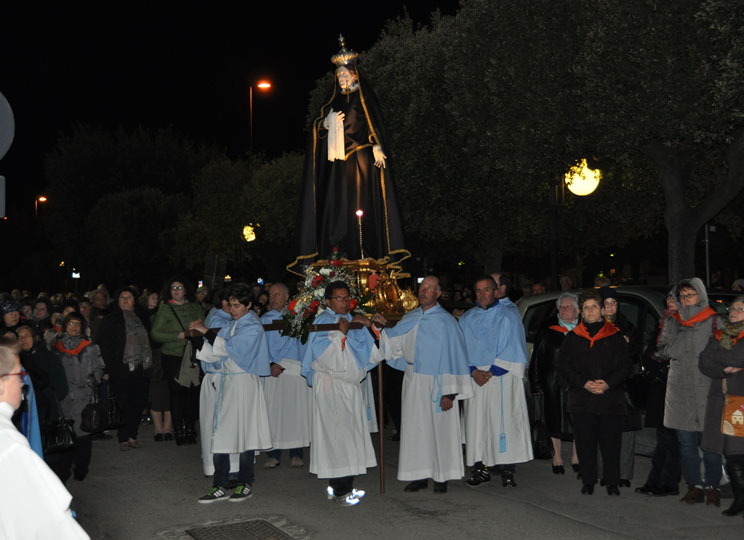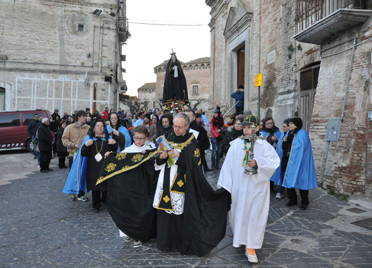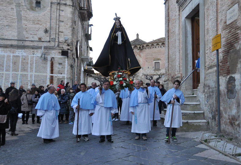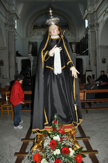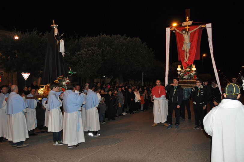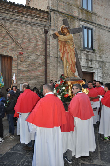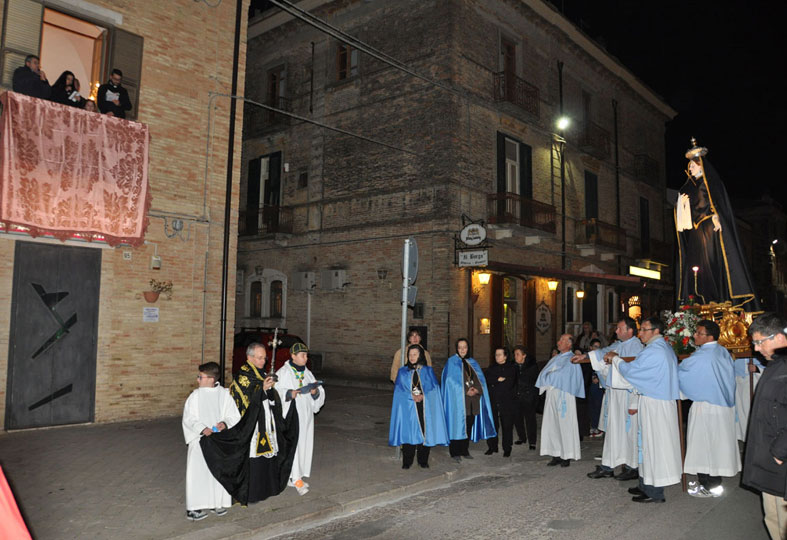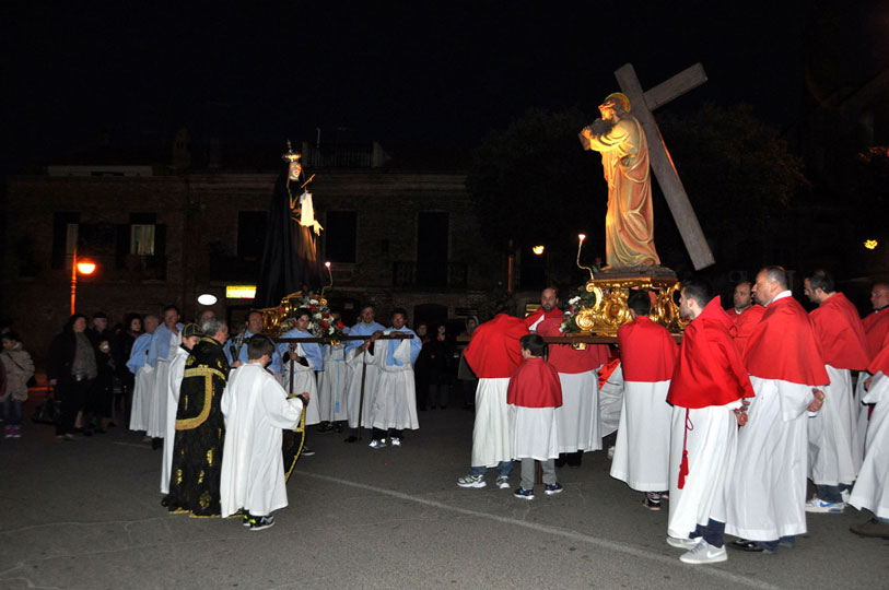 Il 3 aprile 2015 alle ore 18 esce la processione del Venerdì Santo. Dalla chiesa di S.Anna l’antica statua dell’Addolorata del 700, restaurata, (statua conosciuta e  venerata ai tempi di don Luigi Centuori (1874÷1959), arciprete della parrocchia di S.Mercurio dal 1912), realizzata con la tecnica polimaterica, per la prima volta con il suo nuovo abito nero orlato da un merletto dorato viene portata in processione (vedi “Le Palme e la nuova statua dell’Addolorata (13-4-2014)”) accompagnata da donne vestite di nero. Dalla chiesa di santa Maria esce la statua lignea di Gesù portacroce, accompagnata  dagli uomini. L’incontro tra Maria e Gesù avviene all’imbocco dello stradone De Luca. I due tronconi formando un’unica sfilata proseguono in processione lungo Corso Garibaldi sostando per le declamazioni dei misteri della Via Crucis dai balconi. A metà corso l’Addolorata incontra Gesù crocifisso, statua dell’Ara Pacis uscita dalla chiesa della Trinità. Le tre statue, accompagnate dai fedeli in preghiera, nei pressi della fontana incontrano la statua di Gesù morto, uscita dalla chiesa di S.Maria. La processione del venerdì santo termina il suo cammino davanti alla chiesa di S.Anna, dove viene celebrato il rito della Resurrezione con l’esposizione della  statua di Gesù risorto.