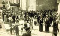 La foto di Ottavio Giacci documenta la partecipazione dei devoti e dei sacerdoti alla processione del patrono, appena uscita dalla chiesa di S.Mercurio: la banda musicale di Serracapriola, il giovane don Adamo D’Adamo con il braccio reliquiario d’argento di S.Mercurio, i frati del convento dei cappuccini, l’arciprete don Luigi Centuori, don Pasquale Iammarino (nominato arciprete della chiesa di S.Maria nel 1908), e il canonico don Giuseppe Presutto. Quest’ultimo, chiamato benevolmente don Pèppe, viene ricordato per la sua umiltà, generosità, cultura. Devolveva i suoi risparmi in beneficenza. Fu l’educatore di tanti giovani di Azione Cattolica, ai quali ricordava sempre l‘adorazione a Dio e la venerazione ai santi. Combatteva il fanatismo e la tifoseria degli adoratori di statue con un cristianesimo vissuto nella quotidianità, fra la gente, con cui gioiva il giorno della FESTA. Morì povero, a 77 anni, il primo ottobre del 1954.