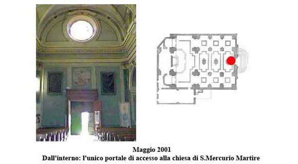 Maggio 2001 Dall'interno: l'unico portale di accesso alla chiesa di S.Mercurio Martire In alto, a destra e a sinistra dell'ingresso, due dipinti su tela deteriorati, raffiguranti San Pietro e San Paolo.