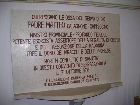 Tre mesi prima di morire, Padre Matteo da Agnone fu assegnato al convento di Serracapriola, dove morì e dove ancora si trova la sua tomba. Il Processo diocesano sulla fama di santità è iniziato ufficialmente il 19 giugno 1996.