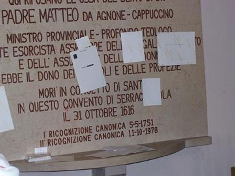 La signora Geneviève, dalla Francia, ha inviato questa testimonianza che pubblichiamo volentieri a gloria di Dio e per la causa di Padre Matteo d’Agnone. “Prima di partecipare con mio marito al pellegrinaggio presso la tomba di Padre Matteo d’Agnone, a metà dicembre 2009, ero stata per due volte da un esorcista. Infatti da tre anni sono vittima di attacchi malefici che mi provocano una sensazione di bruciore su tutto il corpo. Quando l’esorcista mi imponeva le mani, cadevo al suolo e nei giorni seguenti provavo un certo sollievo, ma l’effetto non era duraturo. Nove giorni prima del pellegrinaggio in Italia, avevo iniziato a recitare le litanie a Padre Matteo da Agnone, insieme al rosario. Sull’autobus, in direzione di Serracapriola, continuavo a recitare le preghiere a Padre Matteo, per chiedere la liberazione. Giunta in chiesa, io e mio marito abbiamo appoggiato le foto dei nostri cari sulla pietra tombale di padre Matteo, in posizione verticale. Quando abbiamo tolto le mani, alcune foto sono rimaste incollate alla tomba, sfidando la forza di gravità: erano quelle delle persone che avevano più bisogno di preghiere, cioè mia madre, operata di tumore, e mia figlia in crisi adolescenziale. Le foto delle altre persone invece non sono rimaste attaccate.