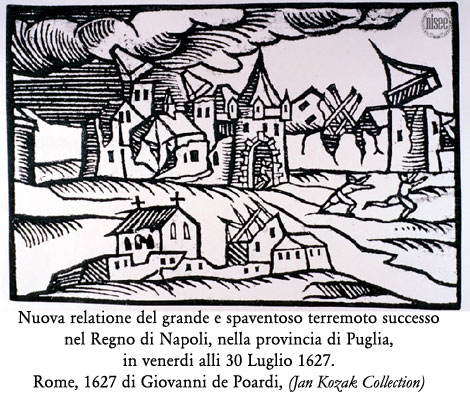 Giunta l'ora fatale, sedici del giorno, si udì muggir la terra non a guisa d'un toro, ma di grandissimo tuono, che non si saprebbe dare altra comparazione, poichè offuscava la mente e l'udito ; ed appresso subito sì vidde ondeggiare la terra a guisa che sogliono l' onde nel maggior agitamento del mare, in maniera che io ed i miei compagni fummo battuti da quell'impeto di faccia a terra, e, senza mancar niente il muggito, nell'alzarci si sollevò ondeggiando di nuovo la terra, e di nuovo caddimo ; ma assai più la terza volta, che ondeggiò con maggiore rabbia che a me parse cadere da sopra un colle. Diede poi una scossa si grande e terribile verso ostro, che rovinò in un subito tutta la Città; e noi avanti a' nostri occhi viddimo, e udimmo, la ruina della Chiesa delle Grazie. Seguitò poi lentamente il tremore, ed alzati, che fummo, si vidde ingombrata, e coverta di una densissima caligine di polvere la Città ; e così si vidde sopra Torremaggiore, S. Paolo, Serra Capriola, Apricena e Lesina; con che quelle terre diedero segno ancora di loro ruina.