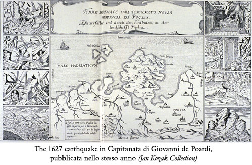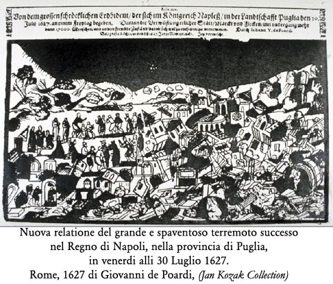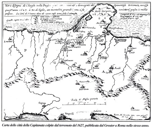 Cominciarono ad udirsi, ma leggermente, i terremoti sin dall'anno precedente 1626, in ottobre, novembre e dicembre; in gennaio del 27, in febbraio, in marzo ed aprile: non s'udirono poi il maggio, e il giugno, sino a' trenta di luglio. E più di venti giorni prima fu una grandissima pioggia nella Puglia, e maggiore nelle nostre parti, che, ancorché fusse di mezza està, si vedevano le campagne piene di acque, che da lungi parevano laghi, e paludi, a cui poi seguirono caldi eccessivi.