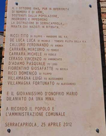 Una lapide per ricordare i 12 serrani che il 1° ottobre 1943, pur in inferiorità di numero e di armi, sostenuti dalla popolazione, insorsero e impedirono la distruzione di Serracapriola minata dai nazisti in ritirata: Ricci Tito di Filippo -Maggiore del R.C., de Luca Luca di Michele Tenente pilota della R.A., Calluro Ferdinando fu Andrea, Carrara Mercurio fu Fedele, Carrara Michele fu Fedele, Ceraso Vincenzo fu Annunziato, DAdamo Pasquale fu Luigi, Fiorentino Giosafatte fu Nicola, Ricci Domenico di Filippo, Villamagna Luigi fu Alessandro, Villamagna Fortunato fu Alessandro e il giovanissimo DOnofrio Mario dilaniato da una mina.