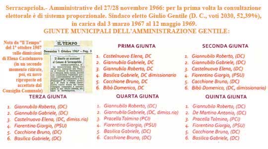 Consiglio comunale in sessione straordinaria. Ai diciannove consiglieri presenti (assente il democristiano Donato Caccavone), il sindaco Giulio Gentile (D.C.) riferisce che, con delibera numero 33, adottata dal Consiglio Comunale di Serracapriola nella tornata del 24 aprile 1968, «fu preso atto delle dimissioni... dalla carica di assessore effettivo» della democristiana Elena Castelnuovo. La eseguita votazione consiliare per la surroga della rinunciataria, votata «per schede segrete», (consiglieri scrutatori: De Siro, Cannarozzi, di Girolamo) attribuiva dieci voti al consigliere di minoranza Tolmino Pracella (PCI) e nove voti a Gabriele Basilica, in atto Assessore supplente della maggioranza governativa.