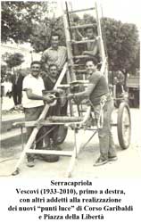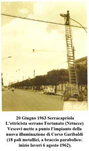 L’ettricista serrano Fortunato (Nètucce) Vescovi mette a punto l‘impianto della nuova illuminazione di Corso Garibaldi (18 pali metallici, a braccio parabolico: inizio lavori 6 agosto 1962).